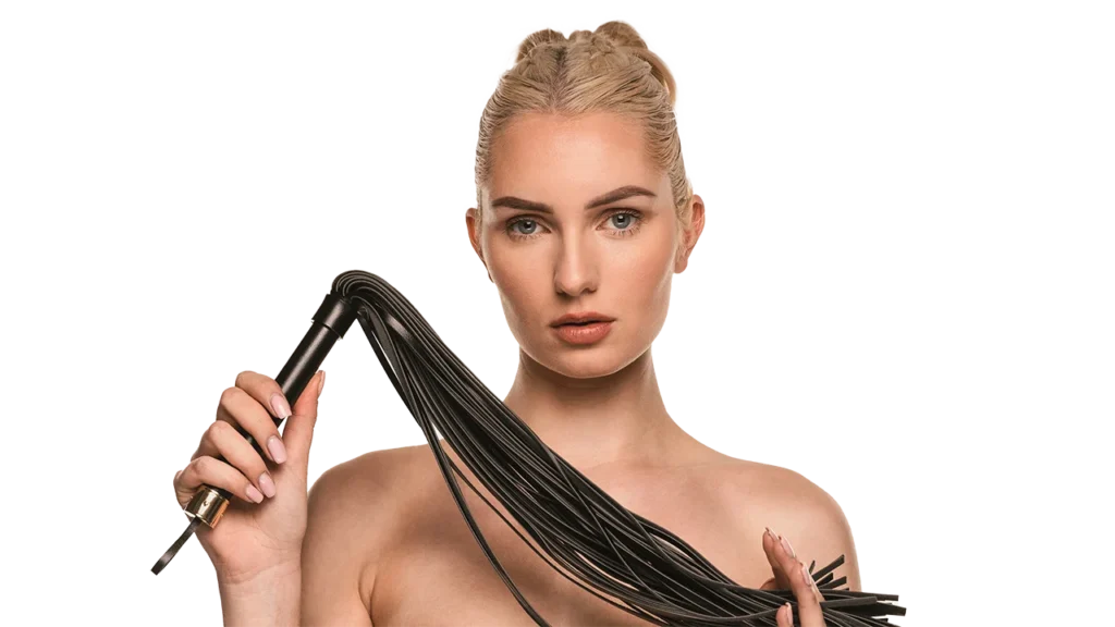 Η πρωταγωνίστρια της παραπάνω ιστορίας (που βασίστηκε σε πραγματικά γεγονότα) προτιμάει στο προχωρημένο επίπεδο BDSM που βρίσκεται, το μαστίγιο τύπου flogger με κρόσσια της εταιρείας INTENSE Fetish, είναι μαζεμένο αισθητικά, με κοντά στο μήκος κρόσσια, σε μαύρο χρώμα, το έχει περισσότερο σαν αξεσουάρ. Αλλά τις μαστιγιές στον Μενέλαο τις δίνει με το μαστίγιο τύπου bullwhip κατασκευασμένο από δερματίνη της εταιρείας RIMBA Leather Whip σε 250cm μήκος και με κρόσσι στην κατάληξη της ουράς του και έτσι του προκαλεί με αυτό κοφτερή και διαρκής αίσθηση του πόνου στις γάμπες και στους μηρούς του.