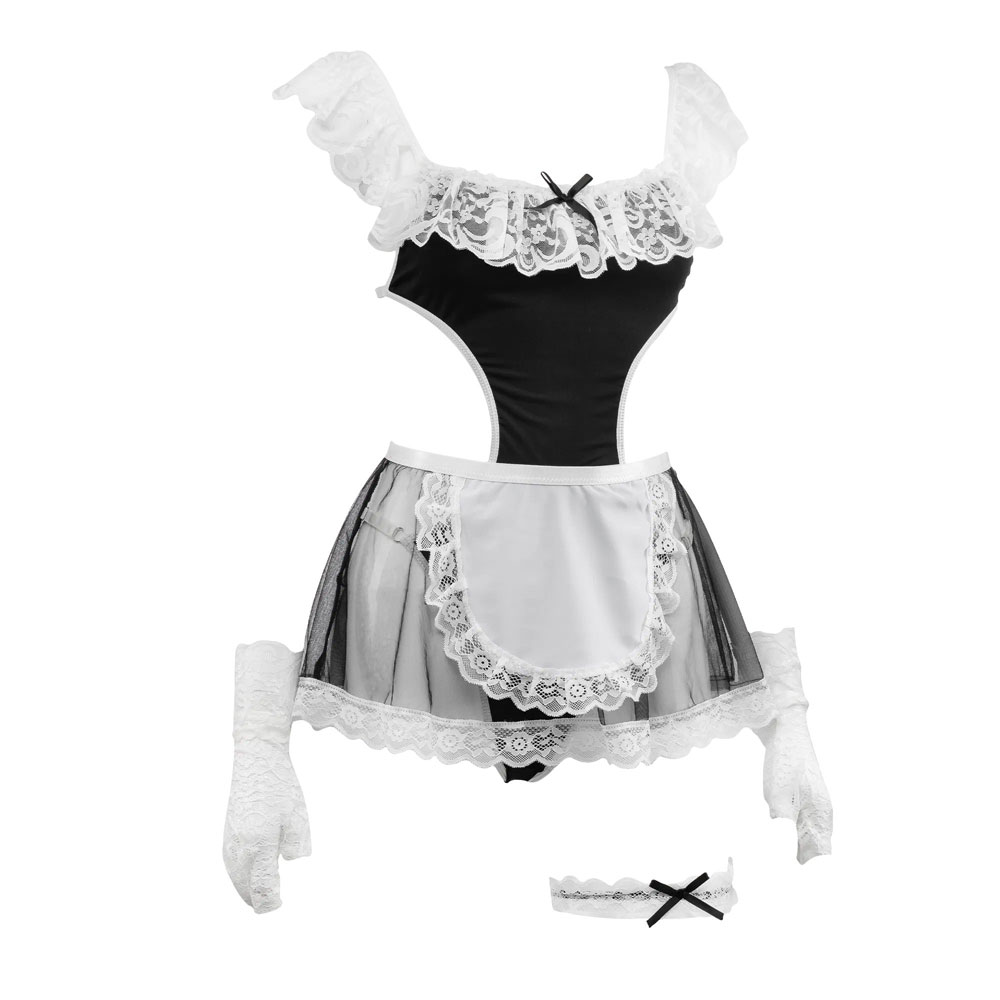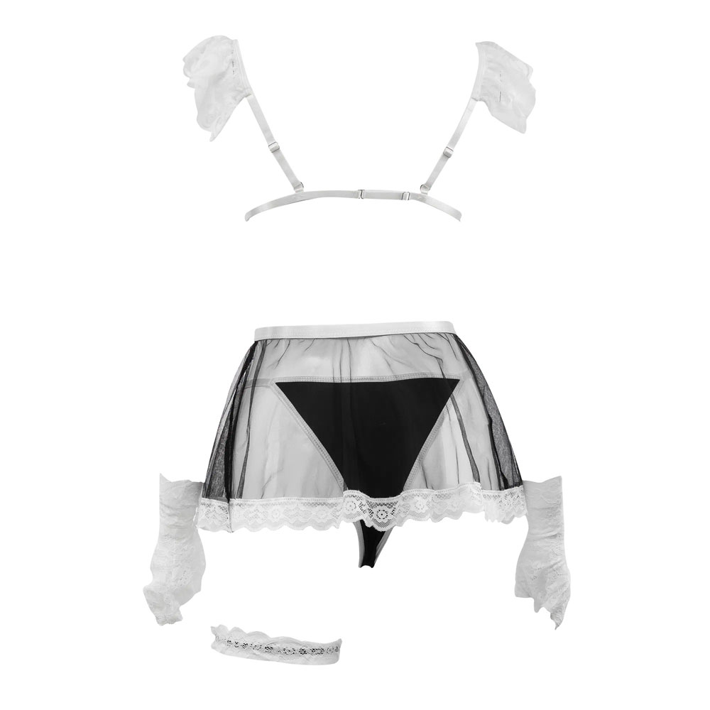 Η μίνι φούστα είναι κατασκευασμένη από ημιδιαφανές πλέγμα και έχει ποδιά μπροστά. Τόσο τα γάντια όσο και η καλτσοδέτα είναι κατασκευασμένα εξ ολοκλήρου από δαντέλα και έχουν φινίρισμα με λάστιχο.