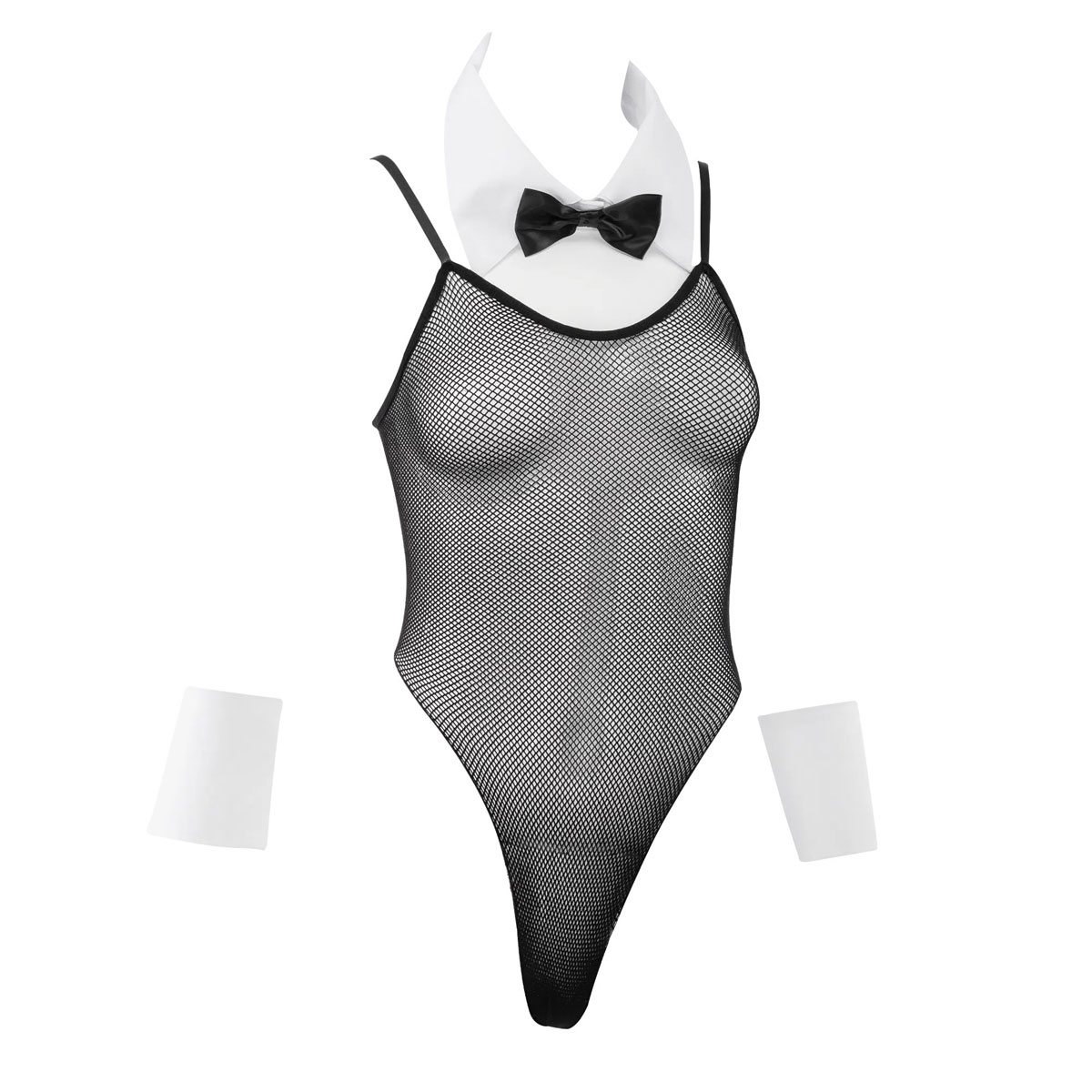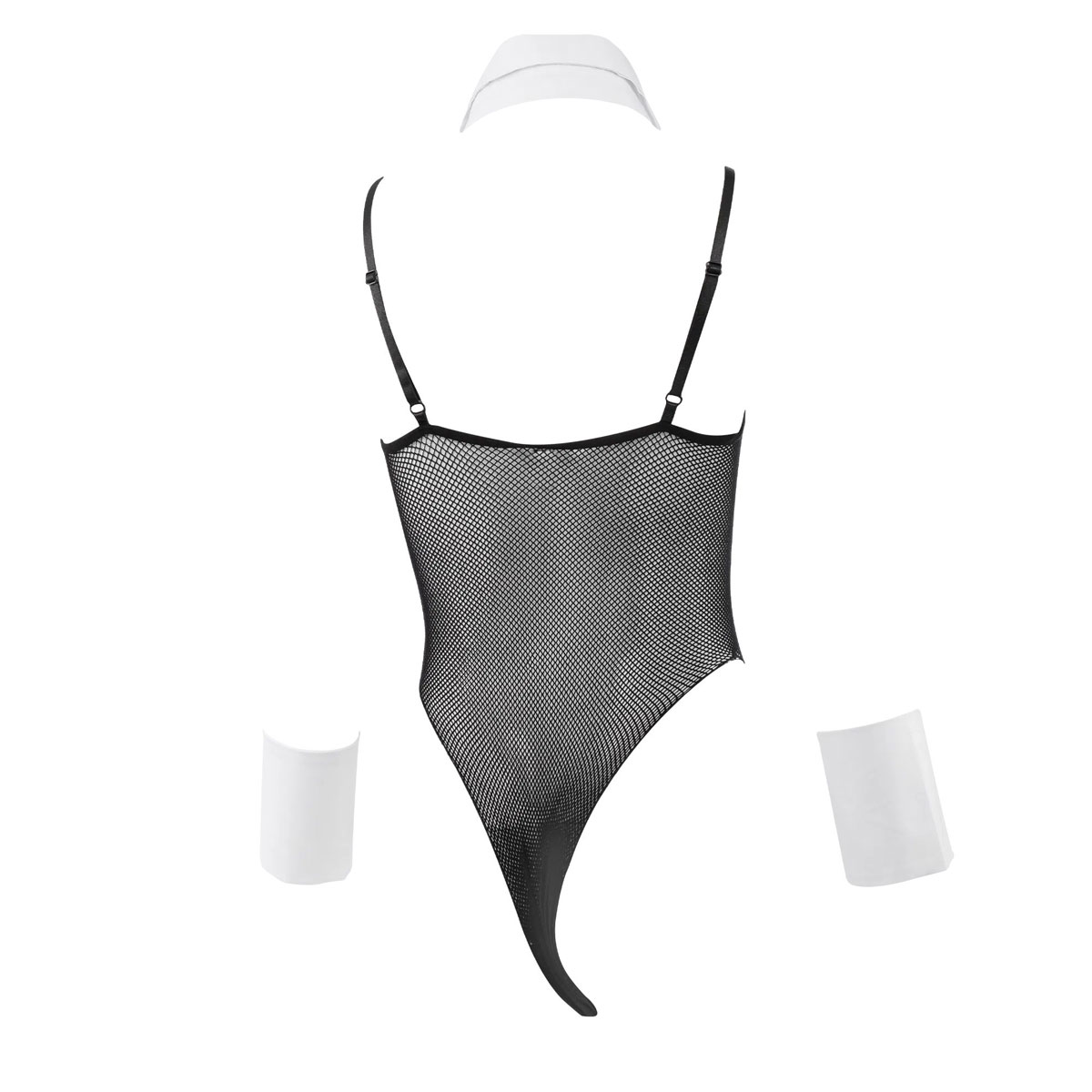 Το κορμάκι αυτού του σετ 4 τεμαχίων είναι κατασκευασμένο από μαλακό, ελαστικό διχτυωτό ύφασμα. Οι μανσέτες και ο γιακάς με φιόγκο είναι κατασκευασμένα από ανθεκτικό ύφασμα και έχουν κλείσιμο με velcro. Ένα εντυπωσιακό, σέξι outfit που δεν πρέπει να λείπει από την συλλογή σας!
